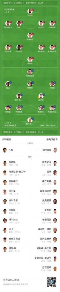 那不勒斯首发:32-瓦尼亚、3-古铁雷斯、5-胡安、31-别克马、37-斯皮纳佐拉、8-麦克托米奈、11-德布劳内、68-洛博特卡、99-安古伊萨、19-霍伊伦、21-波利塔诺