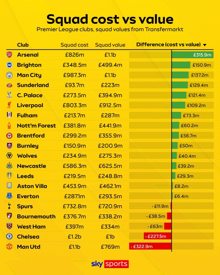 08月27日讯 天空体育基于德转数据,盘点了英超各队阵容的阵容成本,现在的价值,以及相比之下球队阵容价值的变化。其中,阿森纳阵容增值最多,曼联亏损最多。以下是具体数据,单位为镑。