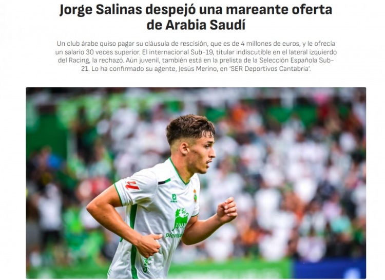 这家沙特俱乐部愿意支付乔治-萨利纳斯400万欧的解约金,并提供比他在桑坦德竞技队现有薪资高出30倍的合同。尽管面对如此丰厚的条件,萨利纳斯还是决定留在桑坦德竞技继续他的职业生涯。