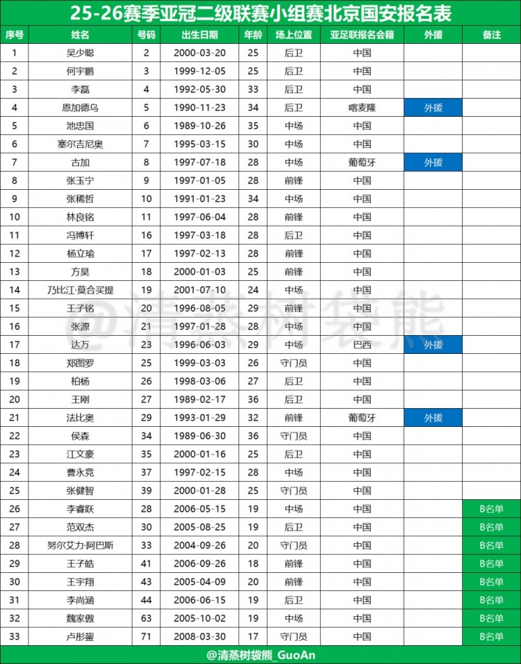 8月19日讯 今日,博主“清蒸树袋熊_GuoAn”在社媒晒出了国安参加亚冠二级联赛的球员报名表,其中恩加德乌、法比奥、古加和达万四名外援在列,斯帕吉奇无缘;国内球员方面,塞尔吉尼奥、张玉宁、张稀哲、林良铭等领衔。
