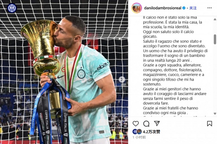 8月30日讯 今日,国米旧将丹布罗西奥在个人Ins上发表长文,宣布退役。
