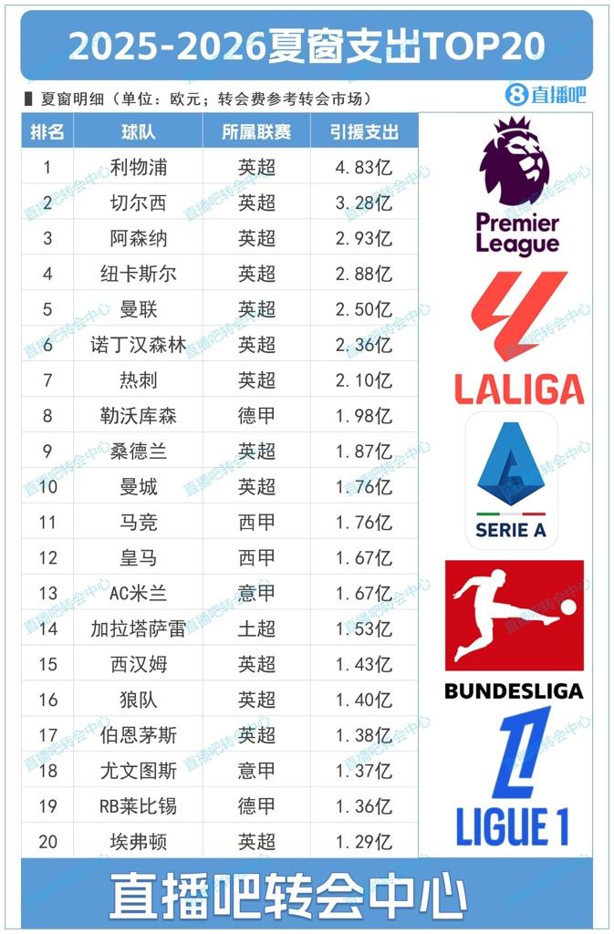 【转会中心】为吧友们总结了夏窗TOP20俱乐部支出。